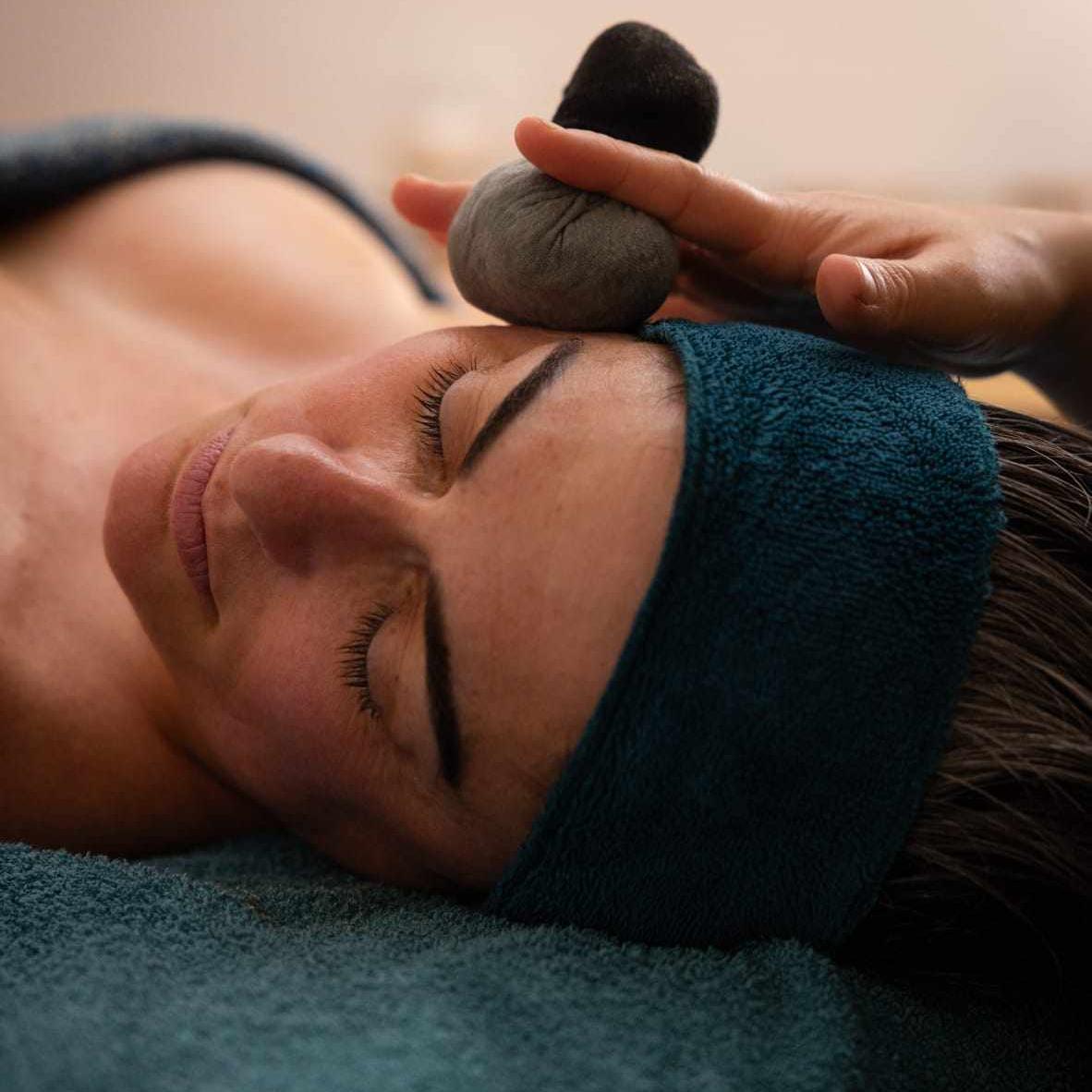 Exfoliation douce, drainage aux pinceaux, massages aux pochons chauds, masque aux plantes.