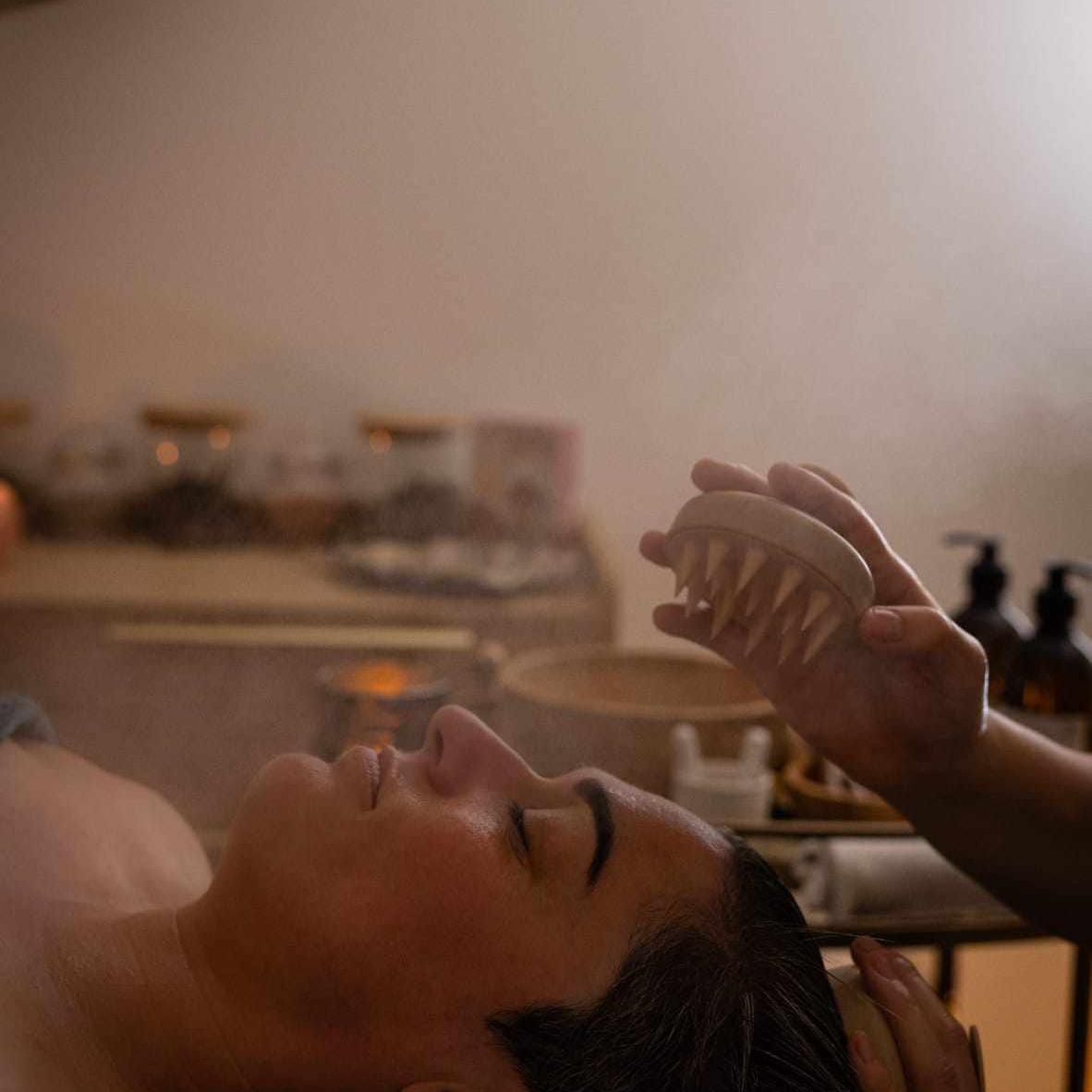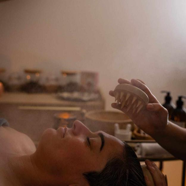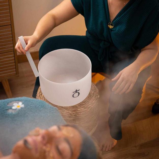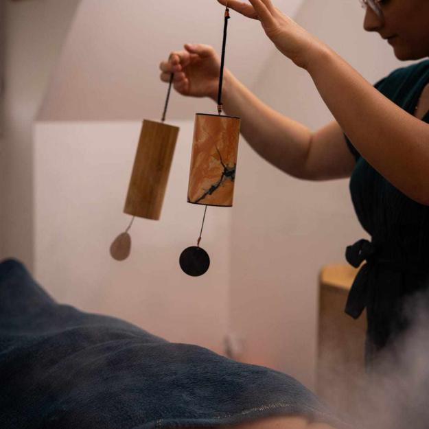Un soin où le massage se mélange aux sons et aux plantes.
